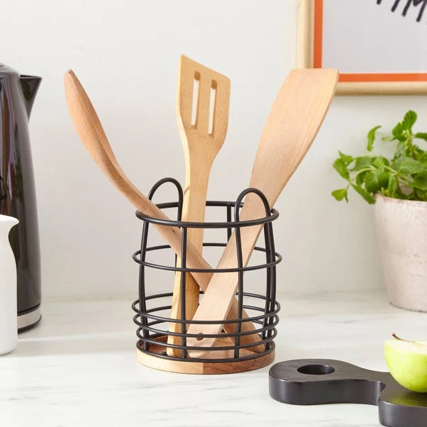 Add a touch of modernity to your kitchen with the Acacia Black Utensil Pot. Made from iron and FSC acacia, this pot combines style with functionality. Its wooden bottom and black matte finish add a contemporary flair, while its large size accommodates all your cooking tools. Keep your kitchen organized and stylish with this versatile and elegant utensil pot. Made from responsibly sourced, FSC-certified acacia. By choosing this product, you are supporting responsible management of the world’s forests. This product is made using acacia wood, therefore variation in colour and finish may occur.