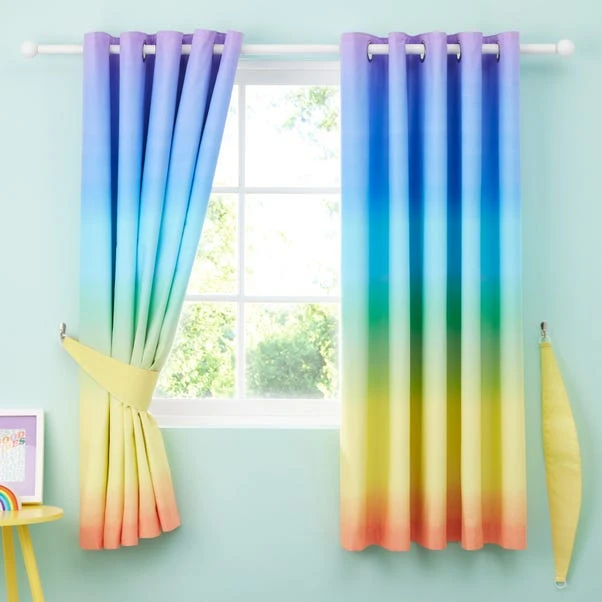 Add colour to your little one’s bedroom with the Bright Rainbow Ombre Blackout Eyelet Curtains. With a handy blackout lining, these eye-catching curtains are made from durable polycotton.
