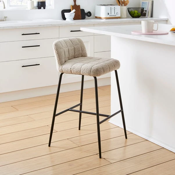The Caden bar stool in tonal boucle offers a unique and stylish seating option for your bar or kitchen. The boucle fabric features a distinctive, looped texture that adds depth and character to the stool, creating a chic and inviting look. The tonal variation in the boucle material enhances its visual appeal, making it a standout piece in any interior. This bar stool is designed for comfort and durability, providing a cozy seating experience while maintaining a sophisticated aesthetic.