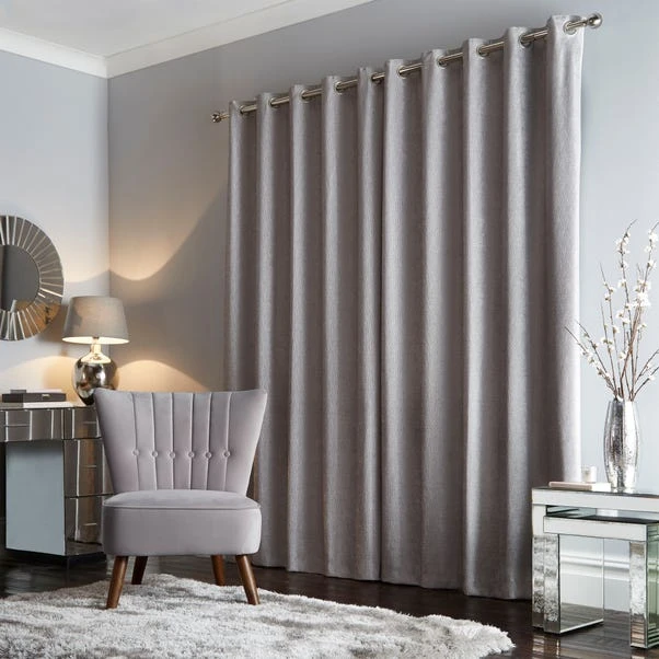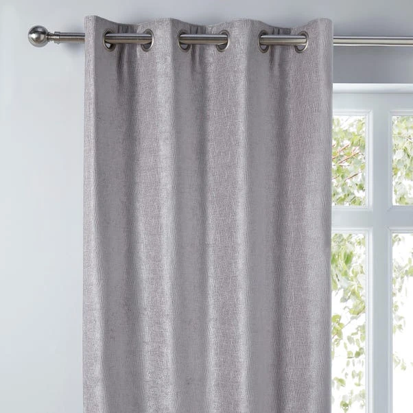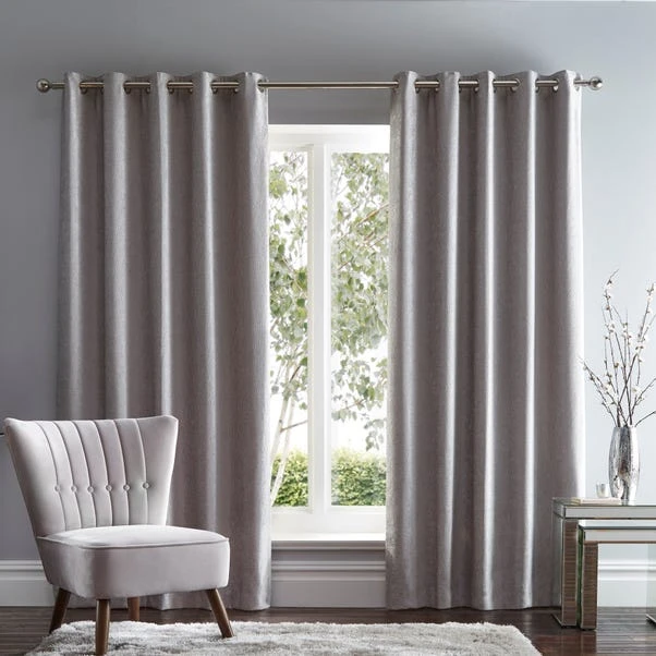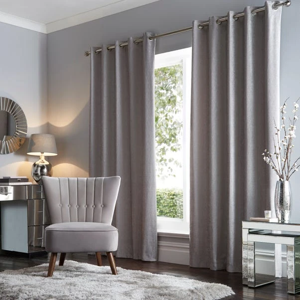 Featuring a subtle contemporary wave design, these silver eyelet curtains are crafted from a sumptuous chenille fabric and are ideal for adding a touch of sophisticated glamour to any room. The modern eyelet header creates full elegant folds and allows these curtains to be easily hung on your curtain pole.