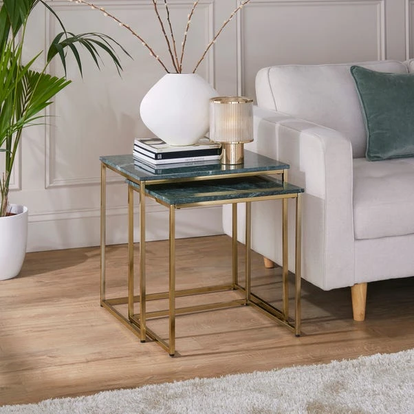 These tables feature luxurious marble tops that add a touch of elegance and sophistication to your decor. The square design offers a modern look, while the sturdy steel legs provide durability and a sleek, contemporary contrast. Perfect for use as side tables or accent pieces, the nesting design allows you to save space when needed.