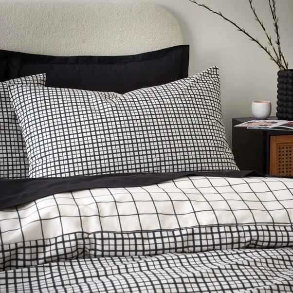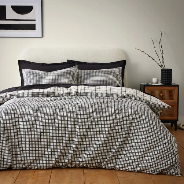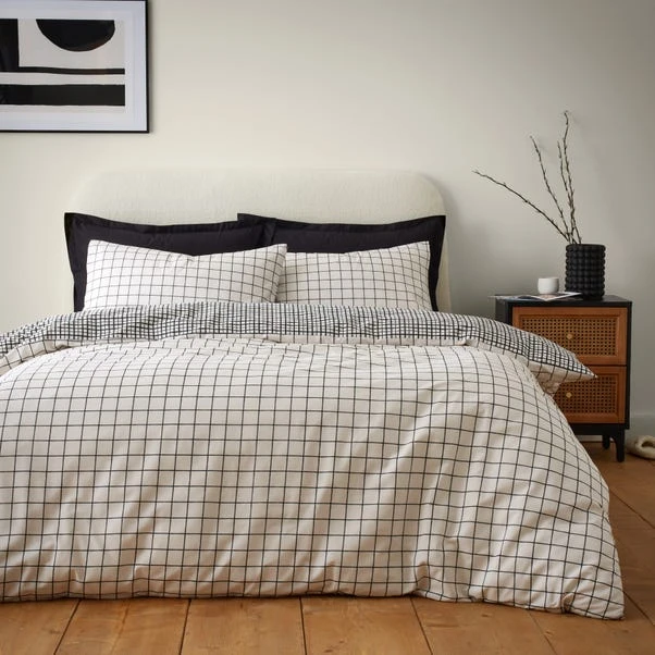 Experience the versatility of this reversible duvet set, offering both a modern check pattern and a playful print. With two options in one set, you can effortlessly switch up your bedroom’s look. Crafted from premium cotton, it ensures both comfort and style for a restful sleep.