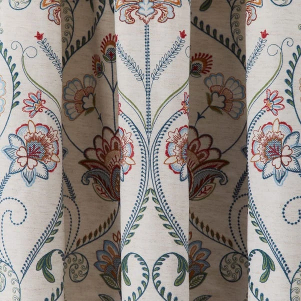 A simply stunning embroidery inspired by the arts and craft movement., this Evelyn mix of pattern and colour will add a show stopping look to any interior with the mix of colour against a natural coloured base. These luxury curtains are available in a timeless pencil pleat header and feature weighted corners for that added luxurious finish. Available in another colourway and other sizes to fit your window fitting.