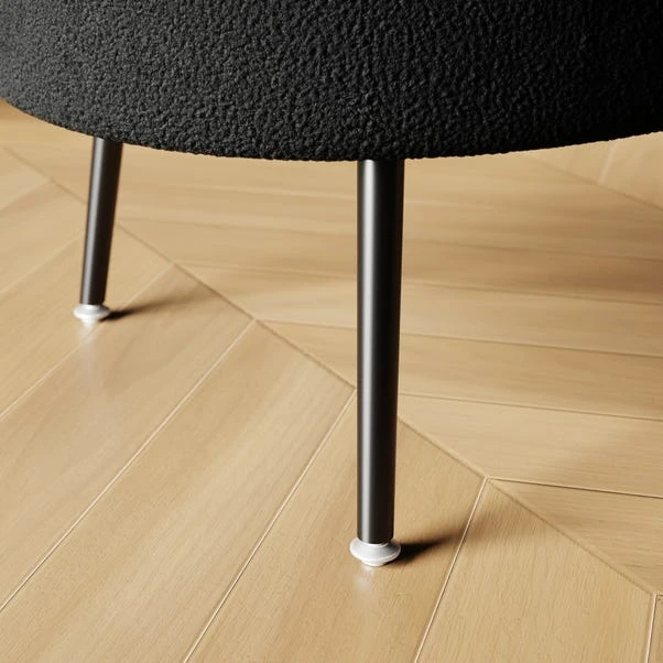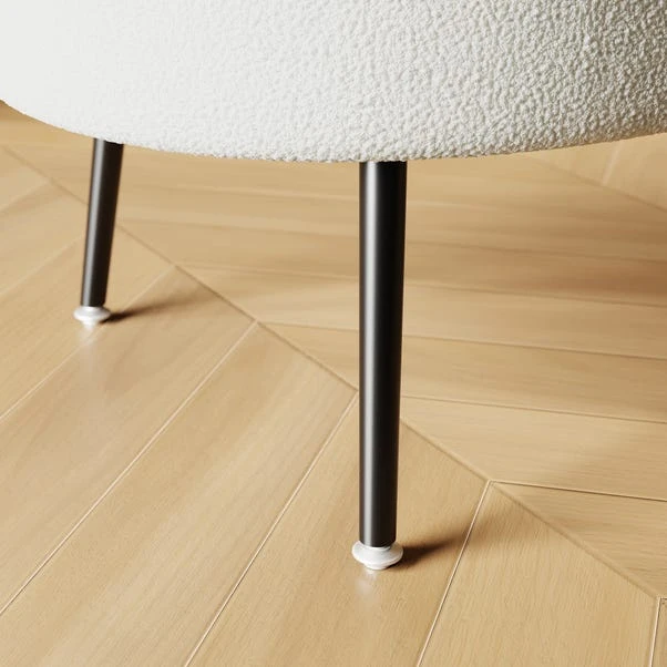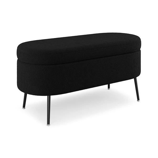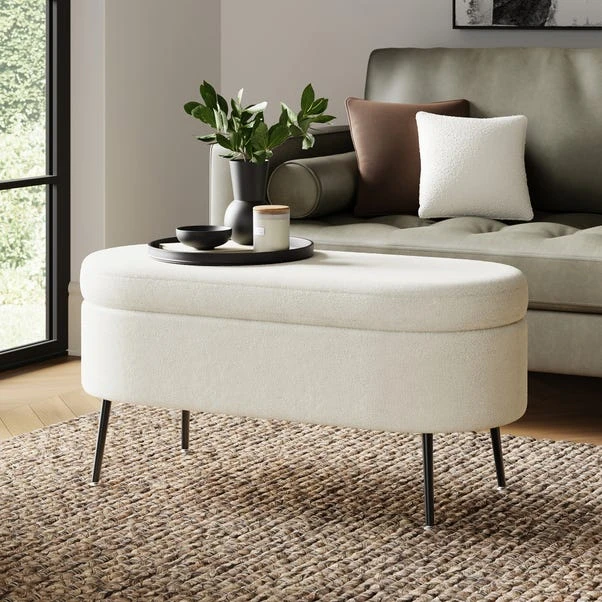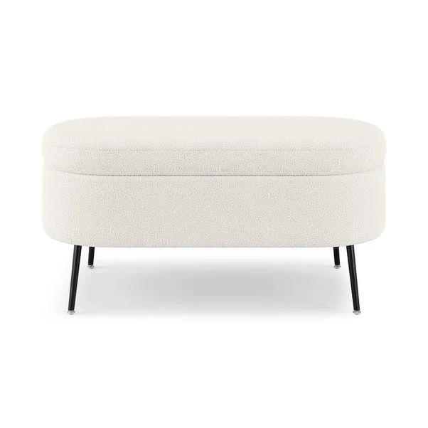 Whether you’re relaxing after a long day at work or entertaining guests, the Evie Storage Ottoman is the ultimate choice for those seeking both style and practicality in their furniture. Designed to offer convenience at its finest, it provides ample storage space hidden within its frame so you can easily keep your essentials close at hand without compromising on the aesthetic appeal. With a soft curved oval shape and upholstered in sumptuous boucle fabric, this two-seater space seamlessly blends convenience with elegance with plush cushioning that ensures maximum relaxation, and chic black painted steel legs add a touch of glamour.