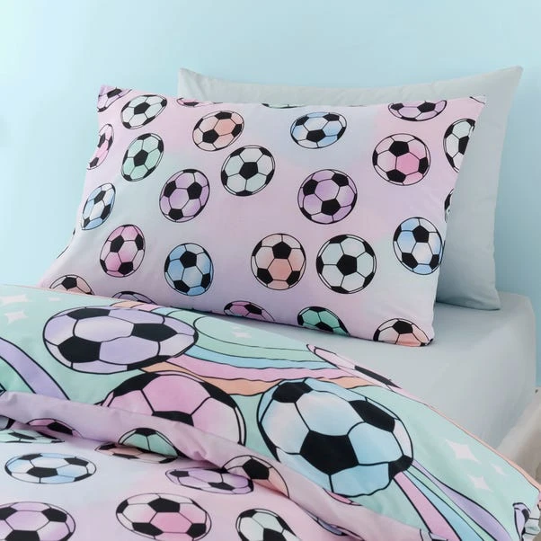 Go football mad with this fun printed football duvet cover and pillowcase set, crafted from a soft blend of polyester and cotton to give you a cosy night sleep. It has an ombre effect which is reversible, giving you two styling options in one bedding set. It comes complete with matching pillowcase(s) and is finished with a secure button closure to give you an uninterrupted night sleep. Machine washable for quick and easy cleaning.
