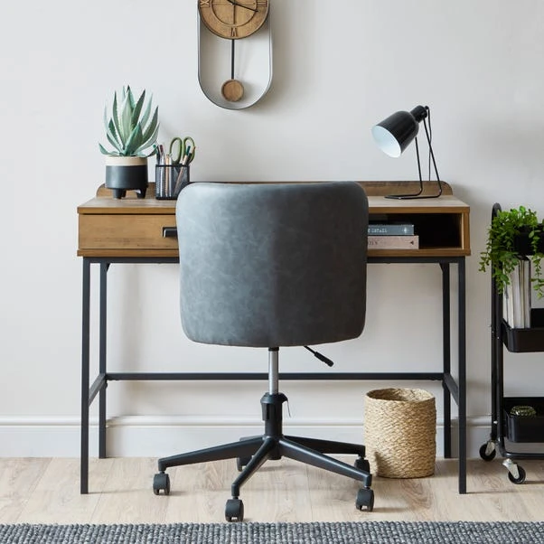 Inspired by contemporary and simplistic styling the Fulton range is a perfect statement piece to any home office space. Made from durable materials with a metal tube base and unique matt finish, this self-assembly range features a rustic pine-effect finish with complementing black handles.
