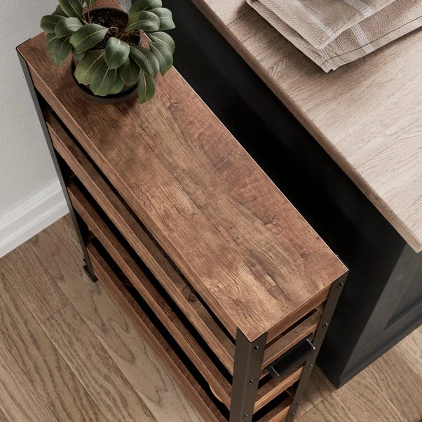 With a mobile and flexible design, this slim trolley has 3 large shelves and good quality handles and fittings. The easy handling and solid structure make this piece ideal for every household, as it is narrow, saving space and has a wooden colourway that will complement an array of home decors, easy to match with other pieces of furniture.