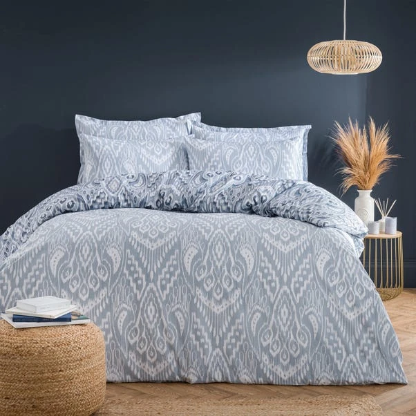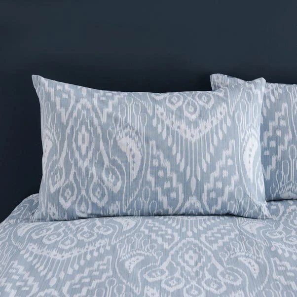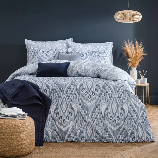 Transform your bedroom with the Global Ikat Duvet and Pillowcase Set. This set features an exquisite Ikat printed design in sophisticated tonal blues, adding a touch of contemporary flair to your space. Crafted from 100% cotton, this bedding is naturally soft, breathable, and comfortably smooth, making it perfect for year-round use. The button closure ensures a secure fit, while the machine washable fabric offers easy care. Coordinating pillowcases are available separately to complete the look.