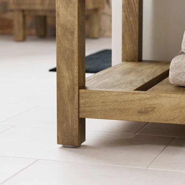 Designed for larger spaces, this unit accommodates two basins, making it ideal for busy households. The internal shelving provides generous storage for toiletries, while the bottom slatted shelf offers convenient space for towels or baskets. With its elegant mango wood effect finish, this vanity unit combines practicality with timeless charm, making it a standout feature in any bathroom.