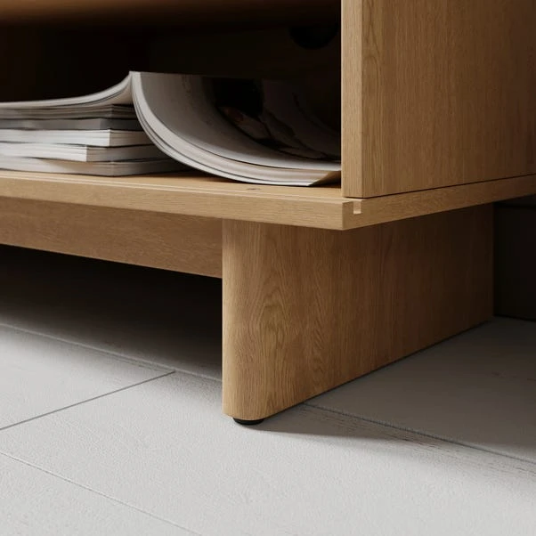 This tv stand is a thoughtfully designed piece, perfect for compact living spaces. The light oak effect finish brings a natural warmth and timeless appeal, while the carved front design adds an elegant touch of craftsmanship. This TV unit features adjustable shelves, offering flexibility for organising media devices, books, or decorative items. Sliding doors provide concealed storage, allowing you to keep clutter out of sight while maintaining a sleek and streamlined appearance. Cable management cut-outs at the back ensure a tidy and organised setup, making it easy to connect electronics without visible wires.
