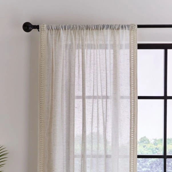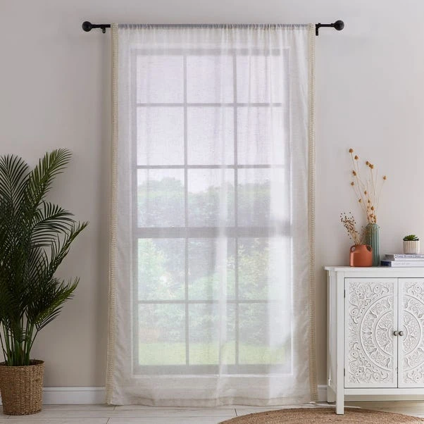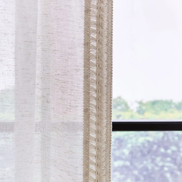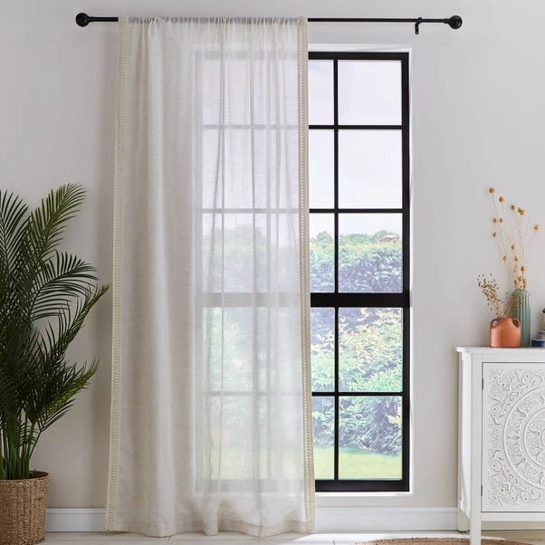Introduce a touch of boho chic into your home with our beautifully embellished Kaia voile. This panel features a delicate lace trim along both leading edges, adding a stylish flourish to any room. Crafted from a polyester and linen blend, it offers a stunning drape that adds texture and elegance. Available in four sizes with a slot top header, it’s an effortless way to infuse your space with personality and charm.