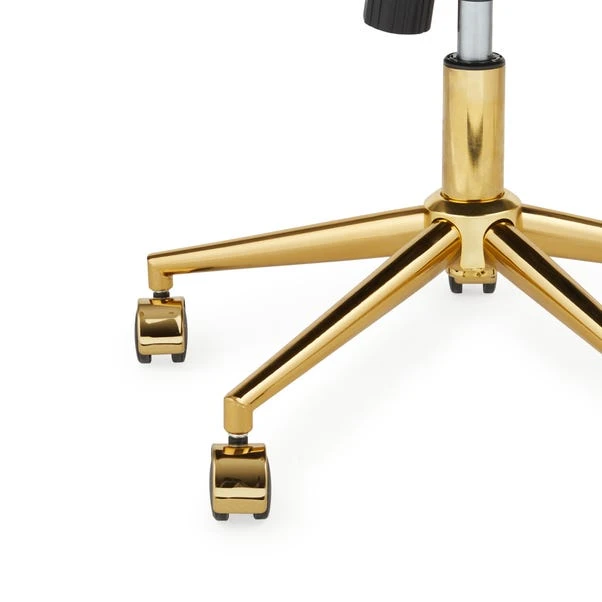 Finished in a soft touch velvet fabric in a selection of gorgeous colourways, the Kendall office chair features a foam filled seat and curved backrest to provide maximum comfort. Inspired by traditional art deco designs, this elegant chair is crafted with a pleated, curved shell back and a gold finished metal base to add a contemporary touch. As practical as it is stylish, this office chair comes complete with a height adjustable gas lift mechanism, and a lockable tilt feature with weight tension control on a wheeled swivel base.