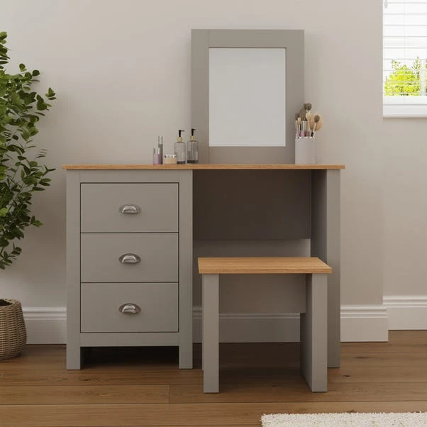With its country cottage styling, the Lancaster Dressing Table set features three large storage drawers in addition to a conveniently sized work surface and rectangular framed mirror. This stunning set comes complete with a matching stool with a contrasting oak veneer top and stunning satin silver coloured drawer pulls.