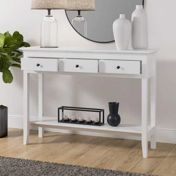 With 3 drawers, a large bottom shelf and table top, this Lynton Console Table is the perfect storage solution for your compact living space or hallway. You will have plenty of space to put away any clutter in your home. Not to mention it looking stylish at the same time!