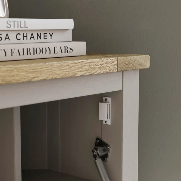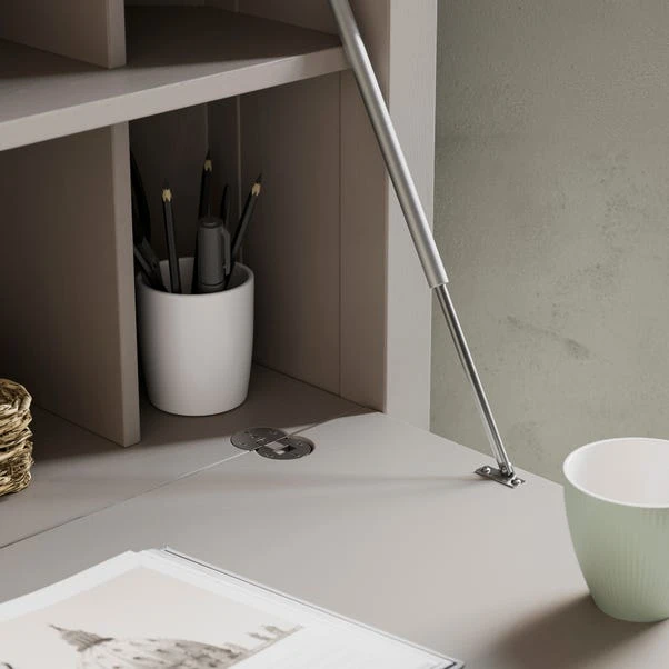This desk features a stable construction, ensuring durability and reliability for all your work needs. The internal shelf, adorned with a captivating oak wood grain effect finish, adds a touch of natural beauty and provides ample storage space for your essentials. Enhanced with brushed metal brass handles, high-quality fittings, and hinges, every aspect of this desk exudes sophistication and luxury. The hideaway desk table design allows you to effortlessly conceal your workspace when not in use, maintaining a clutter-free environment. Thoughtful additions like cable holes ensure seamless organisation, keeping your workspace tidy and efficient.