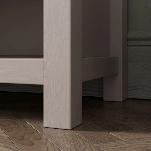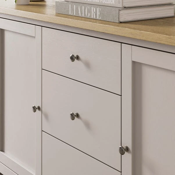 Make a bold statement with this extra-wide sideboard, packed full of storage options. With a mixture of cupboard, drawer and open shelf storage, you will be able to style this piece your way. Adjustable shelves give flexibility, whilst the cupboard doors allow you to store items out of sight. The open shelves are perfect for display, and the piece is finished in a modern stone colourway with wood effect shelves and top. The perfect addition to your living space.