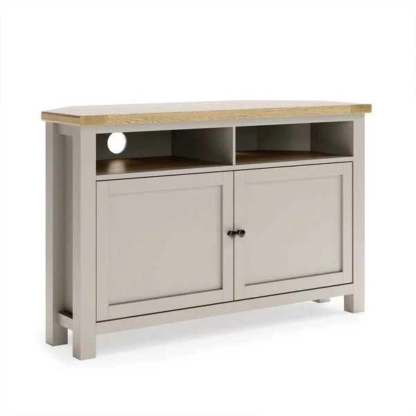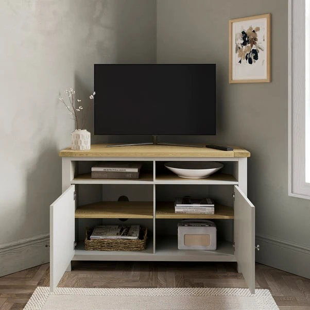 Crafted with oak wood grain paper foil, this unit boasts visible shelves and a stable construction, perfect for housing your entertainment essentials. Featuring a TV stand design, it offers brushed metal brass handles and high-quality fittings and hinges for durability. With cable holes for seamless wire management, this unit ensures a clutter-free space while adding a touch of elegance to your room.