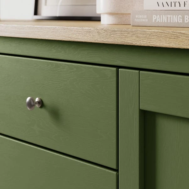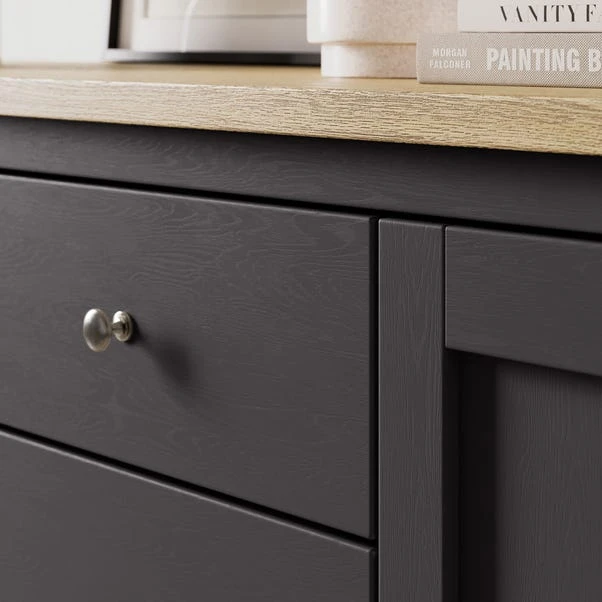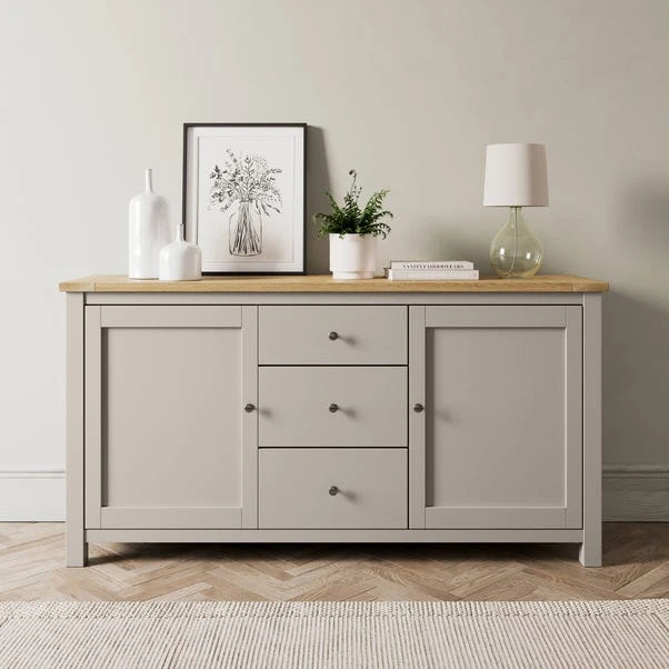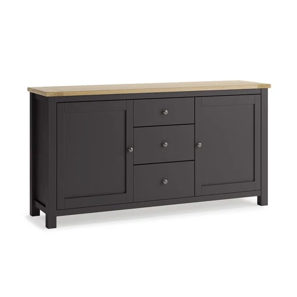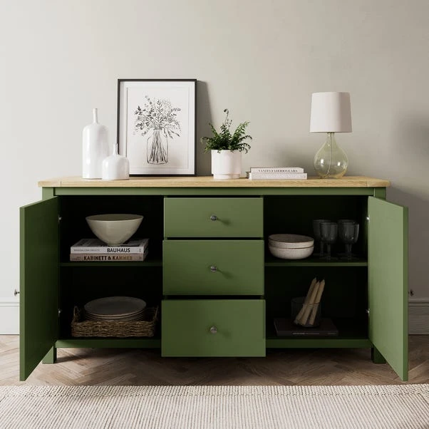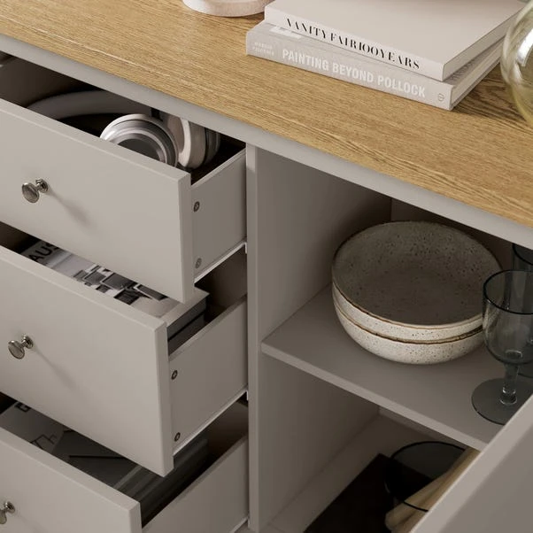Give your dining room a fresh look with this oak effect sideboard. The unit features 2 doors and 3 drawers, offering plenty of space to keep things tidy as well as a lovely large storage space. The brass handles lend a traditional feel while ensuring it will fit in with your existing decor.