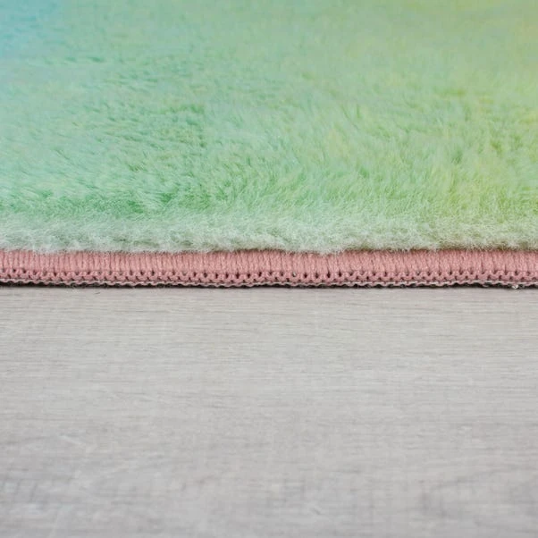Bring a burst of colour and joy to your bedroom with the Ombre Supersoft Faux Fur Rug. Its vibrant, multicoloured ombre rainbow design instantly brightens up any space. Soft to the touch, this rug invites little feet to sink in and play while serving as a captivating focal point in their room.