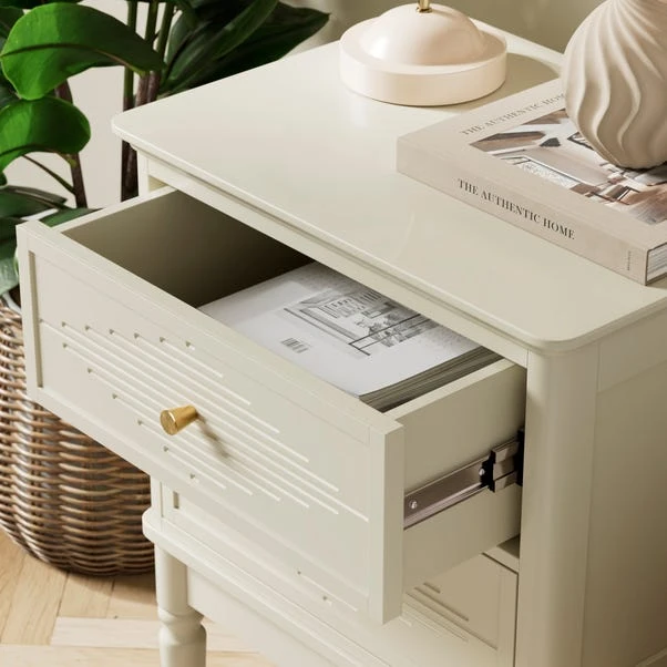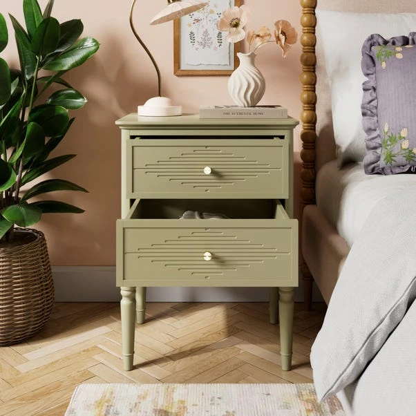 Perfectly proportioned for bedside storage, this 2 drawer bedside table combines classic craftsmanship with practical design. The two spacious drawers provide ample space for nighttime essentials, while the gold hardware adds a subtle touch of luxury. Available in Soft Olive for a fresh, calming aesthetic or Stone for a neutral, effortlessly stylish look.