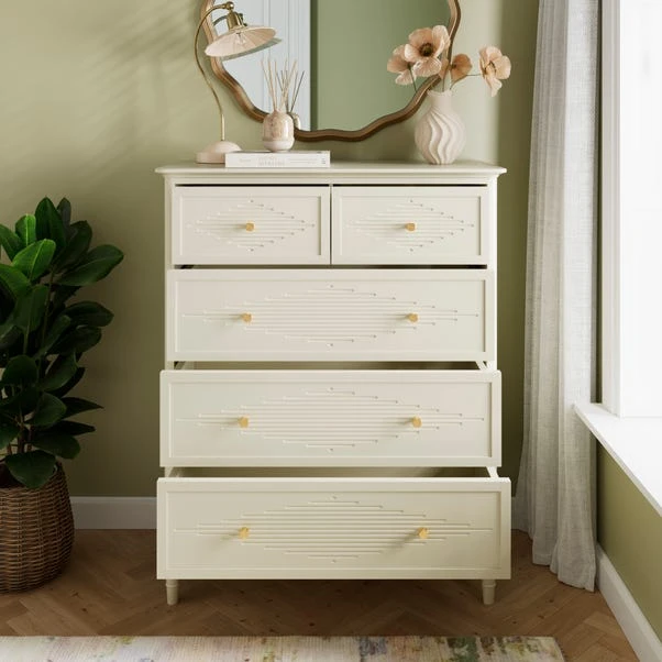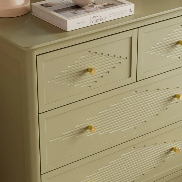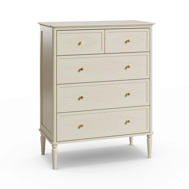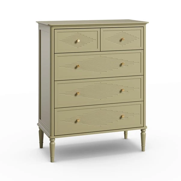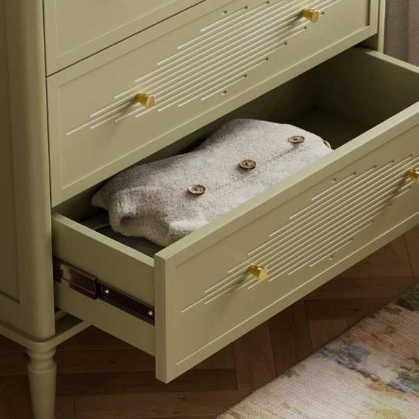 Designed to maximise storage without compromising on style, this chest features five generously sized drawers, ideal for keeping clothing and accessories neatly organised. The Gustavian-inspired detailing, paired with elegant gold handles, creates a refined yet versatile look. Choose Soft Olive for a gentle pop of colour or Stone for a timeless, classic feel.