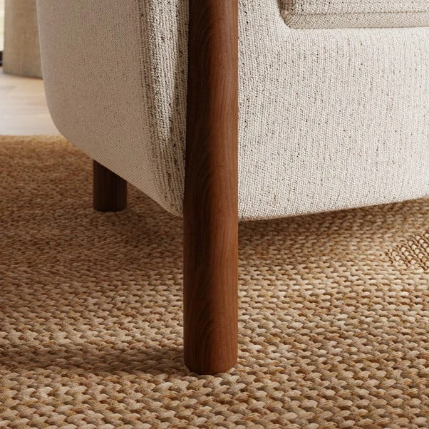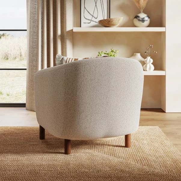 Upholstered in a textured boucle fabric, this chair exudes a cosy charm that pairs beautifully with its sleek wooden legs. The neutral ivory hue and subtle fleck detailing make it a versatile choice for any interior, blending seamlessly with modern and minimalist decor.