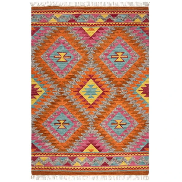 For a burst of brightness in your home, the Roshni Kilim Wool Rug will make the perfect addition. Expertly handcrafted from a wool and cotton mix, this rug boasts long lasting quality for a living space that isn’t afraid to standout. The low pile, Kilim-inspired rug is bursting with a vibrant abstract geometric design, highlighted with the mottled, warm colour tones.