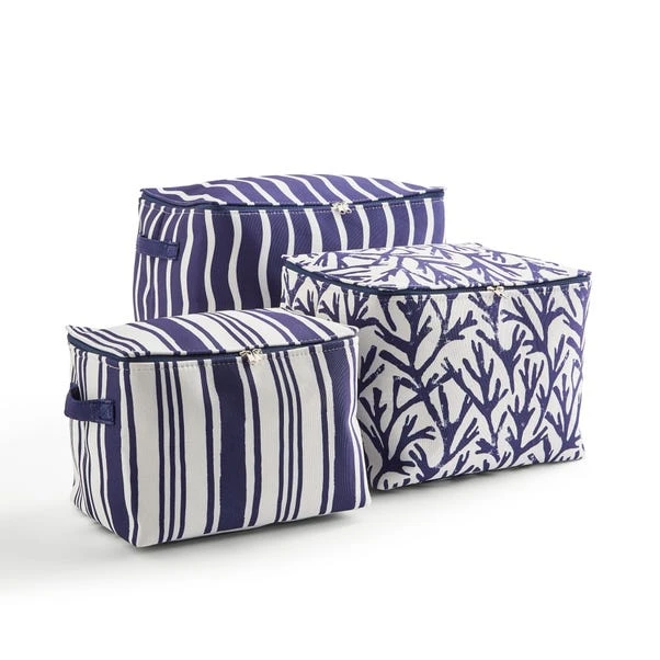 Stay organised in style with this set of three zip-closure coastal storage bags. Featuring contrasting seaside-inspired designs, these bags protect your belongings from dust while offering convenient portability with their sturdy handles. Foldable for compact storage, they are ideal for optimising space in your home.