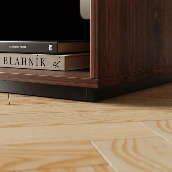 This stylish TV stand features an open shelved section designed to hold a multitude of media devices in a smart and tidy fashion. Additionally, the spacious drawer offers an ideal solution for hiding away items you prefer not to have on display, such as spare cables, DVDs, and games, ensuring your living room remains in pristine order.