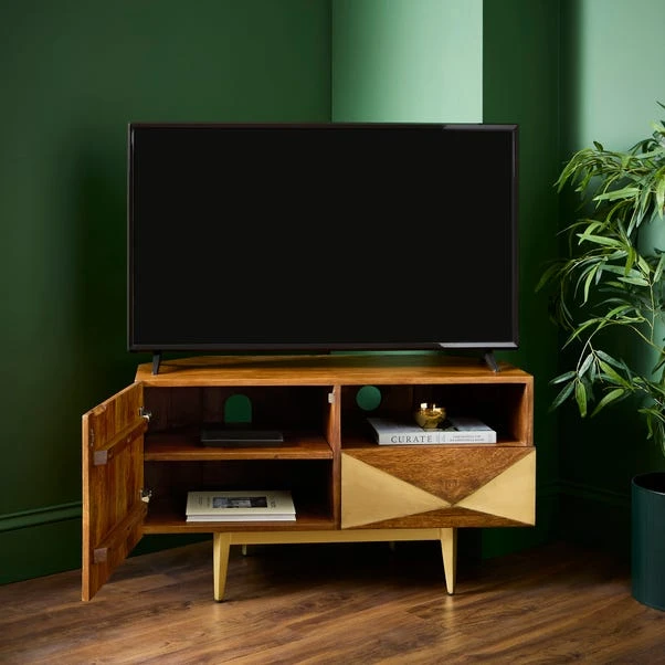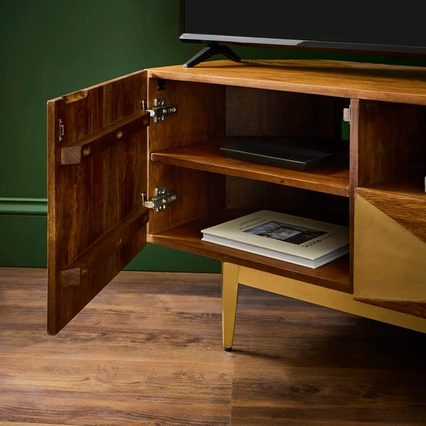 Crafted from premium mango wood, this TV unit highlights the natural variations of the material, making each piece unique. This TV unit showcases exquisite brass detailing that exudes sophistication and charm. The extra-wide design effortlessly accommodates larger televisions, offering both style and practicality. Adjustable shelves to meet your storage needs, and an integrated cable management system, you can keep unsightly wires neatly organised and out of view, ensuring a clean, streamlined setup. The warm tones of natural mango wood beautifully complement the sleek brass accents, creating a contemporary aesthetic that elevates any living space. Redefine your home with a TV unit that seamlessly combines functionality, durability, and timeless style.
