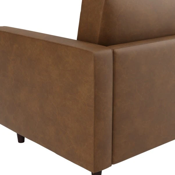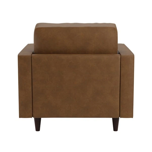 Bring some modern retro styling to your living room with the stylish Zoe Armchair. Finished in a trendy tan colourway, this chair features durable and easy to care for PU leather upholstery, styled with a gorgeous tufted seat cushion, piped edge detailing and stylish tapered solid wood legs. As stylish as it is comfortable, the Zoe is the perfect place to sit back and unwind, featuring a foam filled, sprung seat and fibre filled back cushions. This armchair has a non-reversible back cushion and a fixed seat cushion.